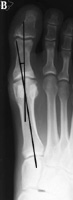 longitudinal axis of the first proximal phalanx and the longitudinal axis of the first