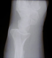 C | Oblique radiograph of the wrist. This shows the fracture of the dorsal margin of the distal radius with some distraction between the major fracture fragments. |