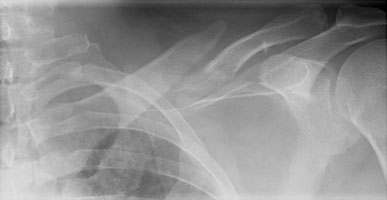 B | AP radiograph of the left clavicle. This particular fracture has not healed, indicating nonunion. |