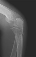 A | Lateral radiograph of the elbow. The typical appearance of an olecranon fracture. The triceps tendon has distracted the fracture fragments. |