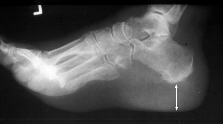 Diagnosis:Acromegaly Discussion:Single lateral radiograph of the foot with a grossly enlarged and thickened calcaneal heel pad. Although not pathognomonic, a heel pad thickness greater than 23 mm may indicate acromegaly. The overabundance of growth hormone in acromegaly causes, among other things, gradual enlargement of hands, feet, and exaggeration of facial features. Not limited to the bones, however, enlargement of other parts of the body, such as the soft tissues of the heel may help to diagnose acromegaly. References: