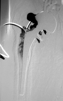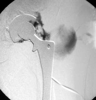 - Contrast aspirated and sent for cultures labeled hip wash.